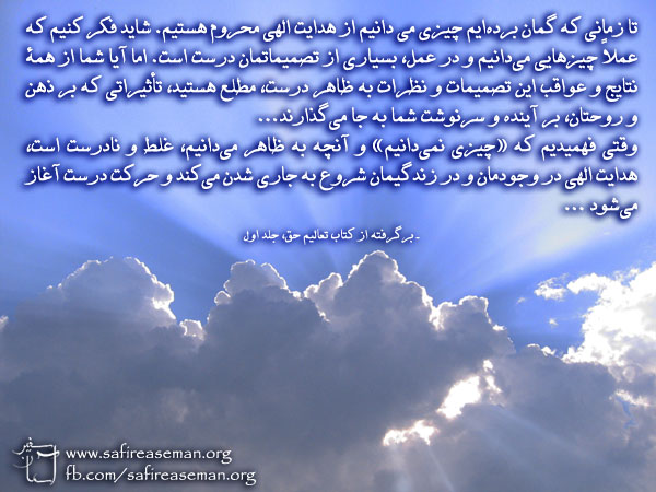 ...باید درك كنیم (نه تشخیص دهیم) كه چشمانمان نمیبیند یا حدّاقل به درستی نمیبیند و گوشهایمان بدرستی نمیشنود. پس تفكر و تشخیص ما، به خوبی و درستی عمل نمیكند و هر چه نتیجهی آن باشد، اشتباه و كاذب است. ذهن ما، فاسد شده و یا در حال فاسد شدن است. ذهنی كه بدرستی كار نمیكند، چگونه ممكن است محصول و نتیجهاش (كه افكار و برداشتهای ماست)درست و صحیح باشد. تا شعور خداوند در وجود انسان جاری نشود، انسان كور و كر است، قادر به تشخیص نیست. ذهنش بیمار و خراب است...