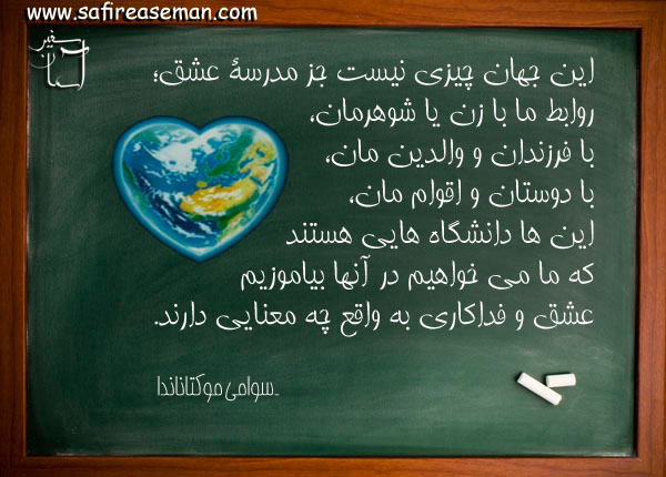 این جهان چیزی نیست جز مدرسۀ عشق؛ روابط ما با زن یا شوهرمان، با فرزندان و والدین مان، با دوستان و اقوام مان، این ها دانشگاه هایی هستند که ما می خواهیم در آنها بیاموزیم عشق و فداکاری به واقع چه معنایی دارند.